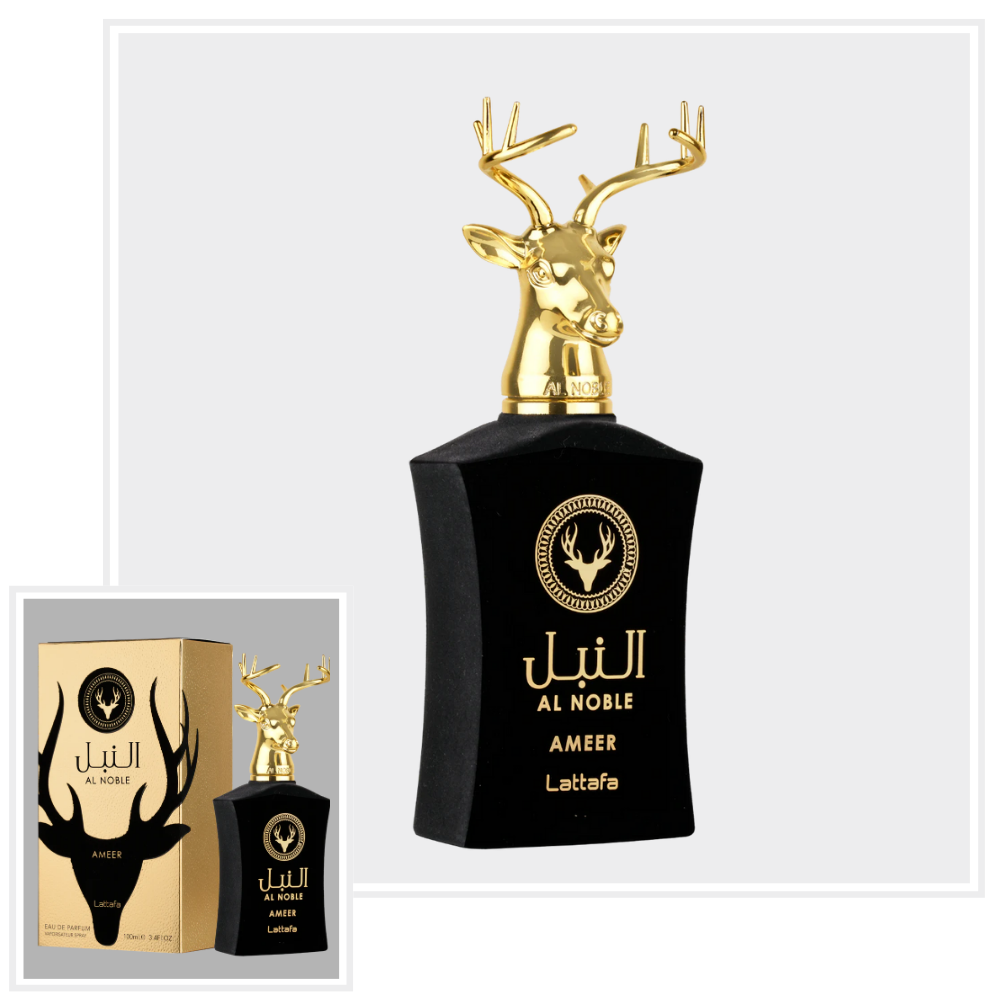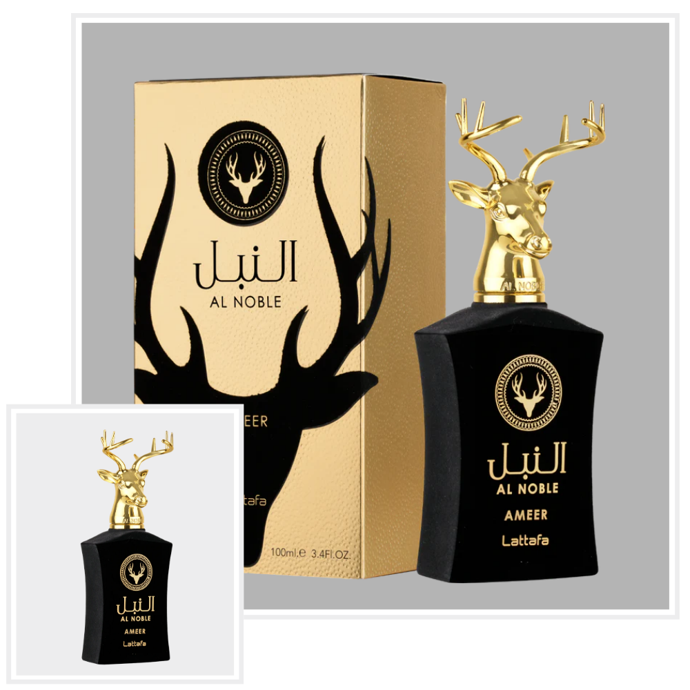 Al Noble Ameer marki Lattafa Perfumes to perfumy dla kobiet i mężczyzn (z preferencją dla mężczyzn). Nutami głowy są Jabłko, Różowy pieprz i Rozmaryn; nutami serca są Goździk (przyprawa) i Nuty kwiatowe; nutami bazy są Agar (oud), Paczula, Labdanum, Cyprys i Wetyweria.