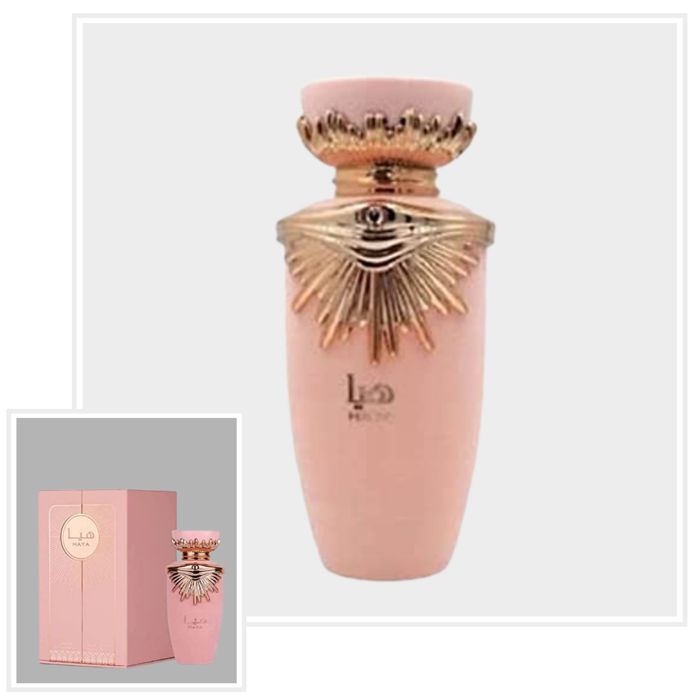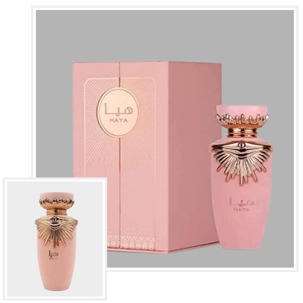 Haya marki Lattafa Perfumes to perfumy dla kobiet. Nutami głowy są Szampan, Truskawka, Tangeryna, Czerwona pomarańcza i Róża; nutami serca są Gardenia, Jaśmin i Orchidea waniliowa; nutami bazy są Bursztyn, Drzewo sandałowe i Kasztan.