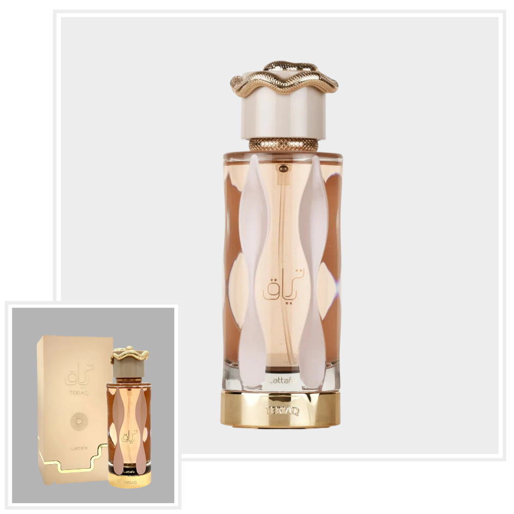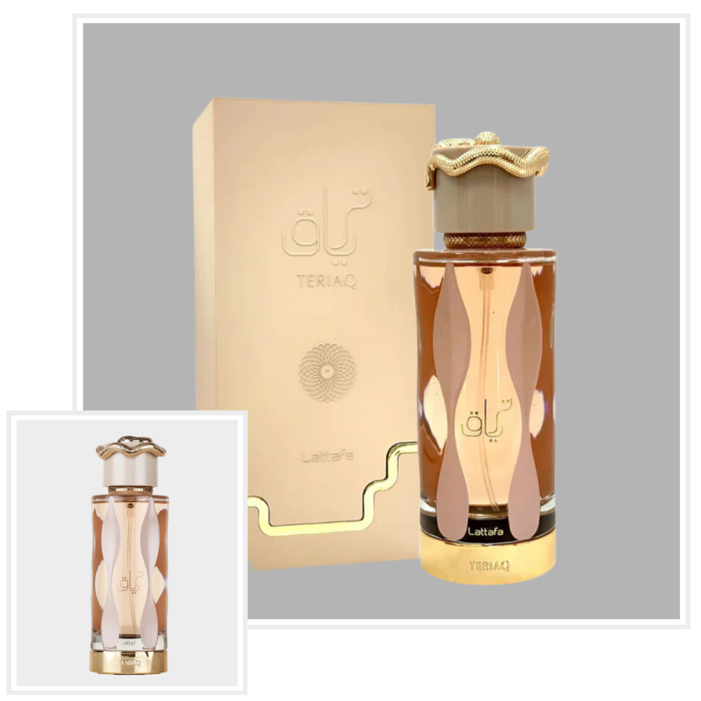 Teriaq marki Lattafa Perfumes to perfumy dla kobiet i mężczyzn. Teriaq został wydany w 2024 roku. Twórcą kompozycji zapachowej jest Quentin Bisch. Nutami głowy są Karmel, Gorzki migdał, Morela i Różowy pieprz; nutami serca są Miód, Rabarbar, Białe kwiaty i Róża; nutami bazy są Skóra, Wanilia, Piżmo, Labdanum i Wetyweria.