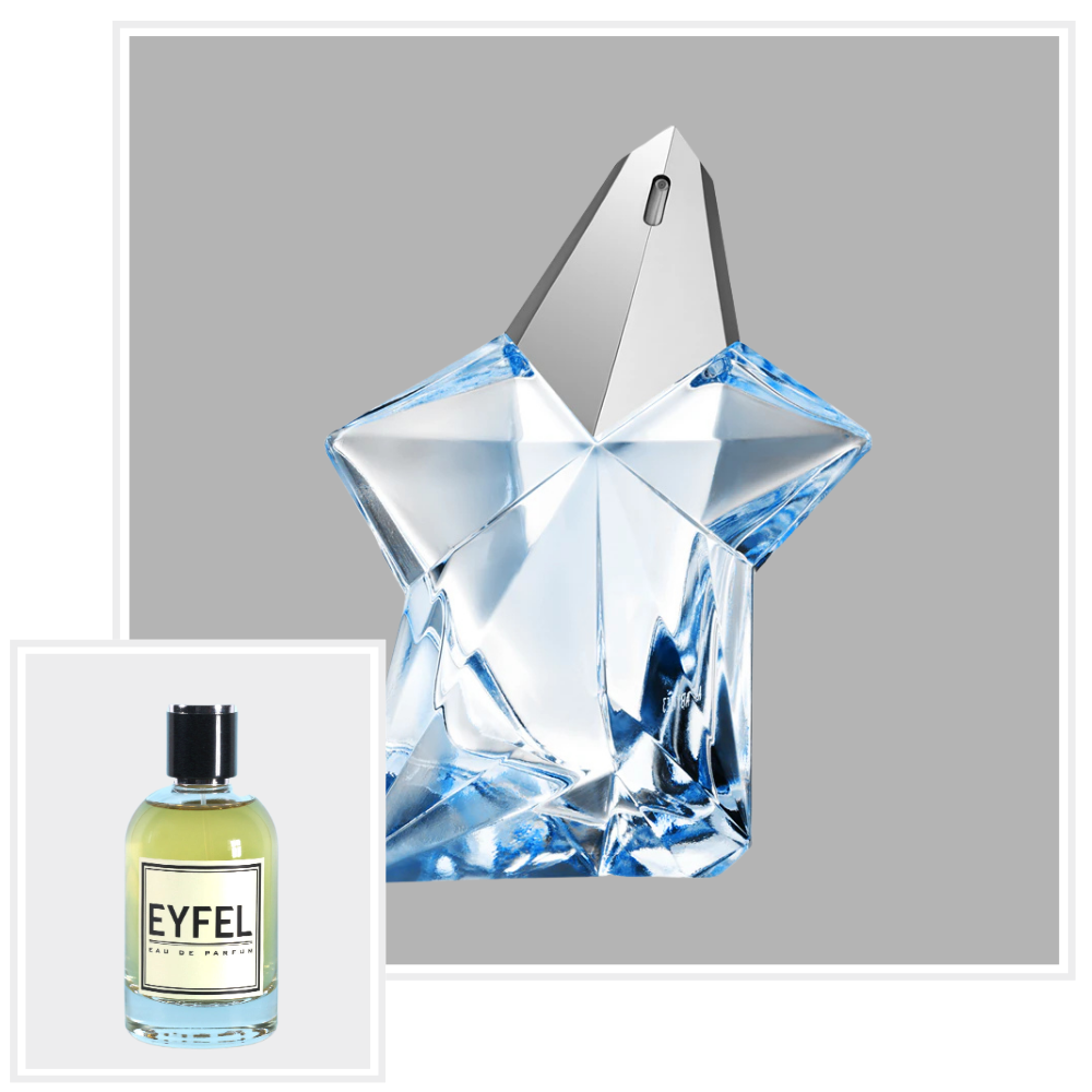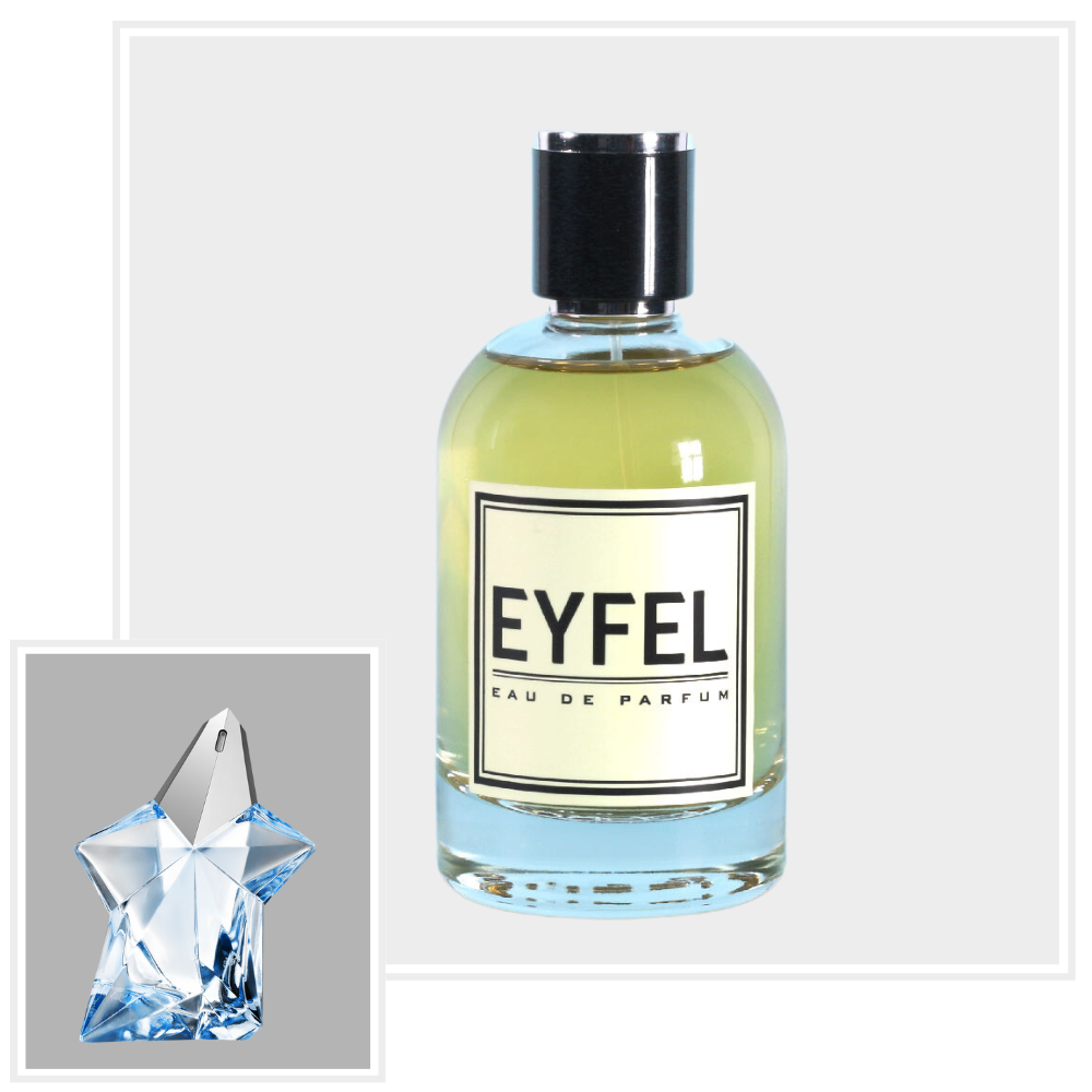 Woda perfumowana Eyfel inspirowana zapachem Mugler Angel łączy moc paczuli ze zmysłowością pralin, czerwonych owoców i intensywnej wanilii. Ważną rolę we wstępie do kompozycji zapachowej odgrywa kalabryjska bergamotka. Następnie rozwija się nieodparcie słodki aromat owoców w czekoladzie i karmelu, przywodzący na myśl przepyszną pralinkę. Podstawą zapachu, który najdłużej utrzymuje się na skórze, jest paczula i wykwintna wanilia.