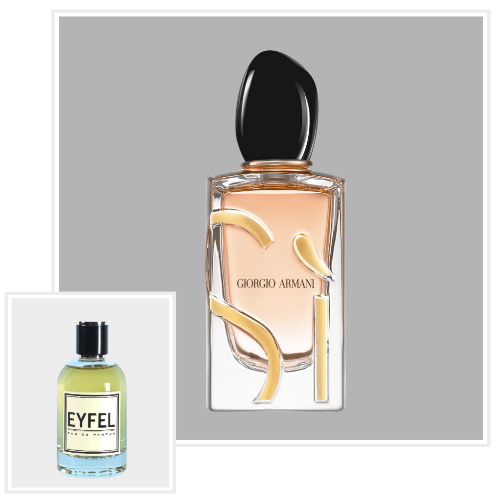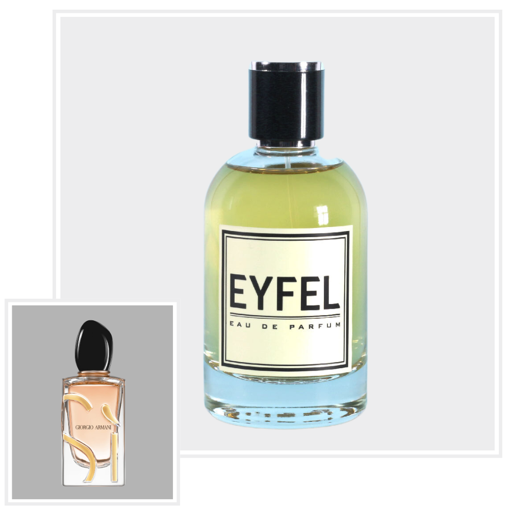 Doskonałą definicję istoty włoskiego gustu kryje w sobie woda perfumowana dla kobiet Eyfel inspirowana zapachem Armani Sì. Zapach stworzono dla wszystkich stylowych i charyzmatycznych przedstawicielek płci pięknej. Połączenie nut kwiatowych, czarnej porzeczki i frezji odgrywa emocjonalny koncert, dzięki któremu powiesz sì – po włosku: tak – wolności, marzeniom, miłości i samej sobie.